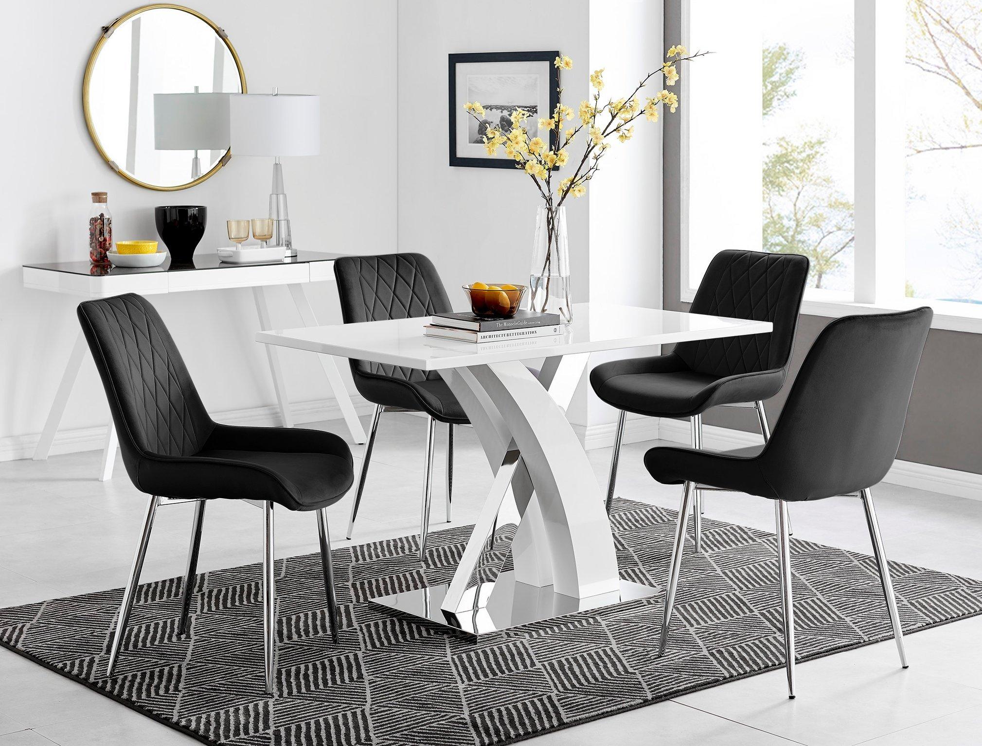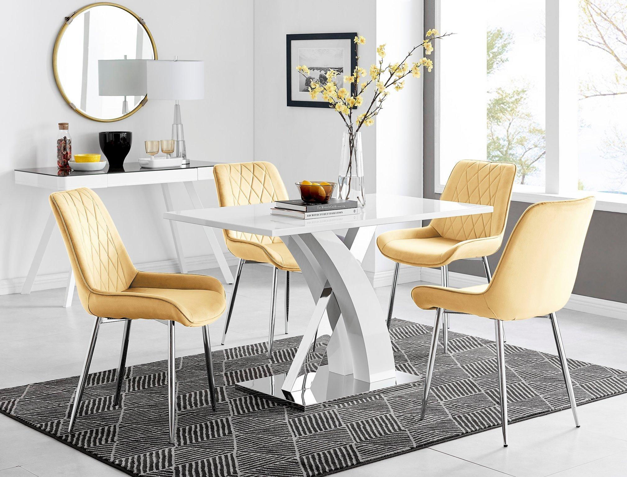 Atlanta White High Gloss and Chrome 4 Seater Dining Table with X Shaped Legs and 4 Soft Velvet Pesaro Chairs