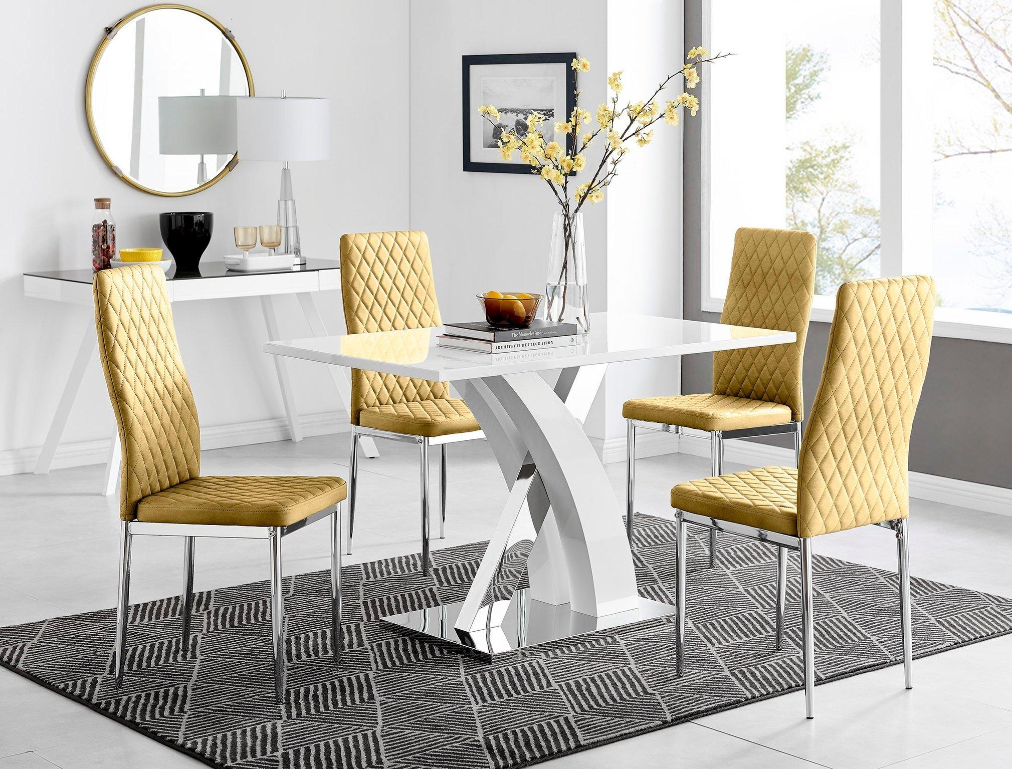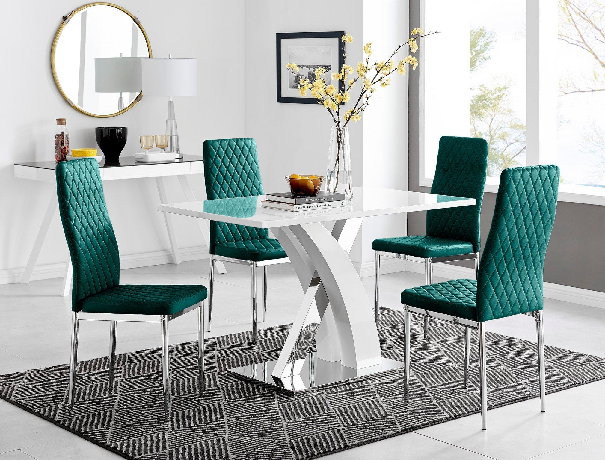Imperia 4 Seater Modern White High Gloss Rectangular Dining Table And 4 Persaro Velvet Chairs