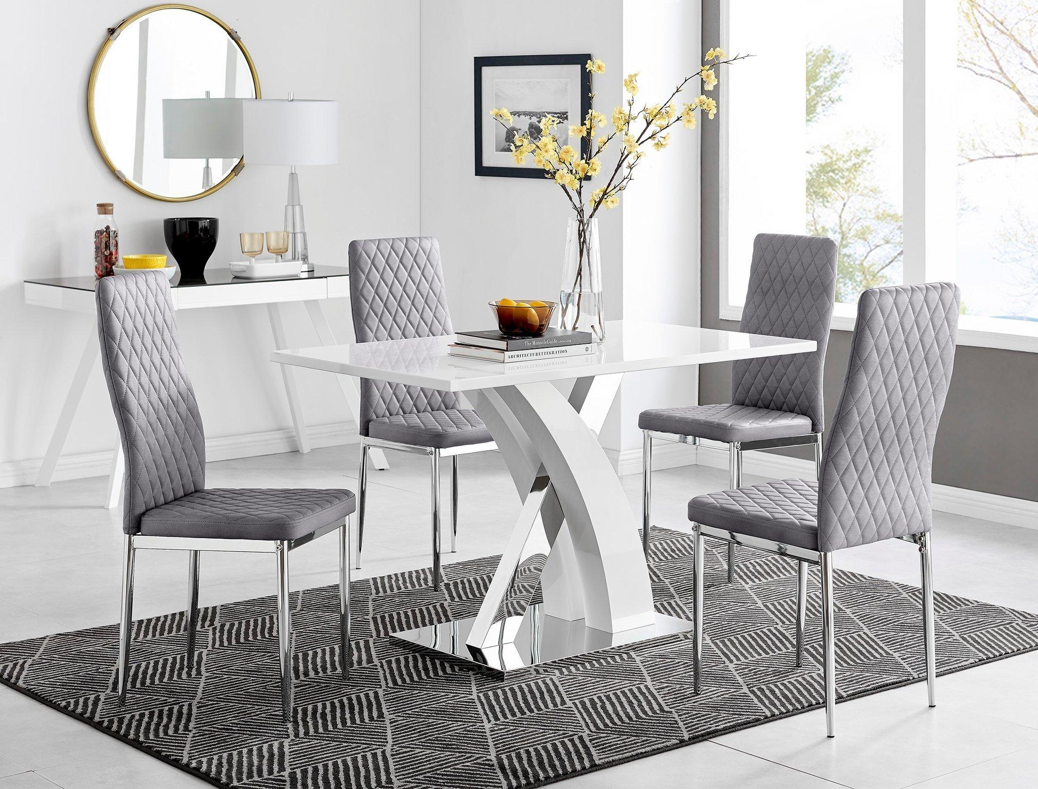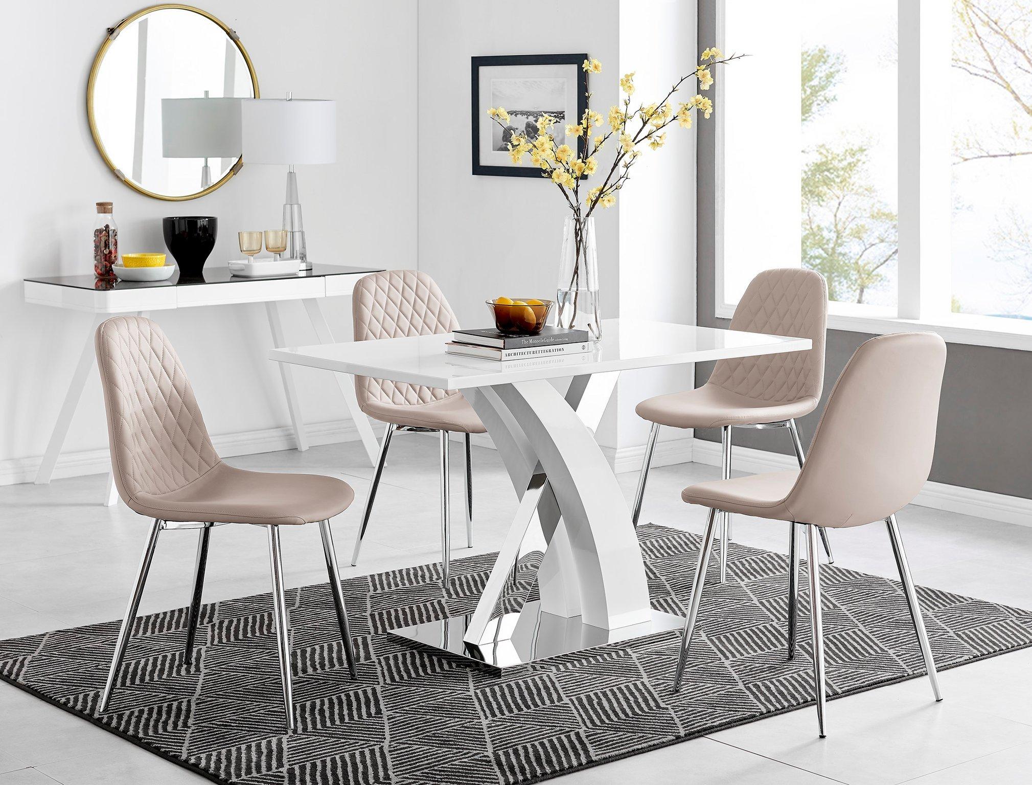 Atlanta White High Gloss and Chrome 4 Seater Dining Table with X Shaped Legs and 4 Faux Leather Milan Chairs