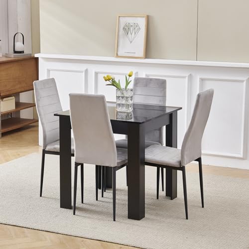 Homullel 75x75 cm Small Dining Table and 4 Chairs, 4 Seater Table and Chairs Set Kitchen Dining Room Set for 4, Compact, Space Saving, Wooden, Glossing Tabletop Black (4 Seats, Flannel Grey #1)