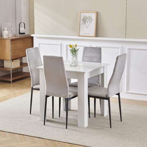 Homullel 110cm Dining Table and 4 Chairs, 4 Seater Kitchen Table and Chairs Set for Space Saving, Compact Dining Room Set for 4, 110x70 cm, Wooden, White (4 Seaters, Flannel Grey)