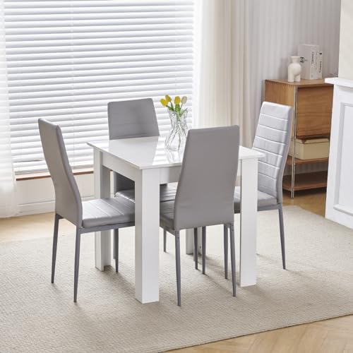 Homullel 75x75 cm Small Dining Table and 4 Chairs, 4 Seater Table and Chairs Set Kitchen Dining Room Set for 4, Compact, Space Saving, Wooden, Glossing Tabletop White (4 Seats, Faux Leather Grey #1)
