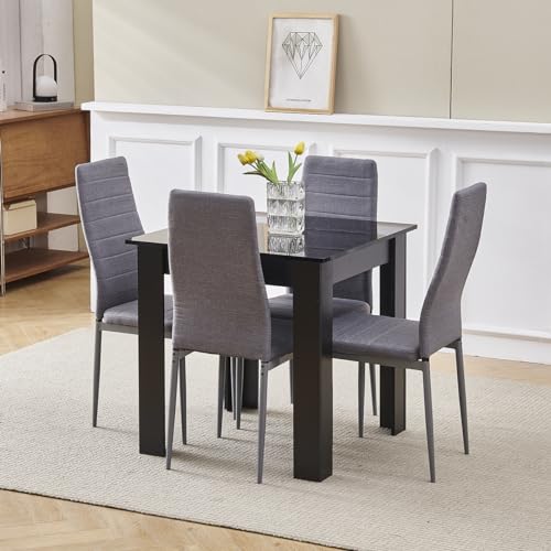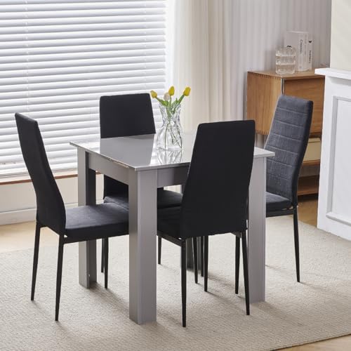 Homullel 75x75 cm Small Dining Table and 4 Chairs, 4 Seater Table and Chairs Set Kitchen Dining Room Set for 4, Compact, Space Saving, Wooden, Glossing Tabletop Grey (4 Seats, Linen Black)