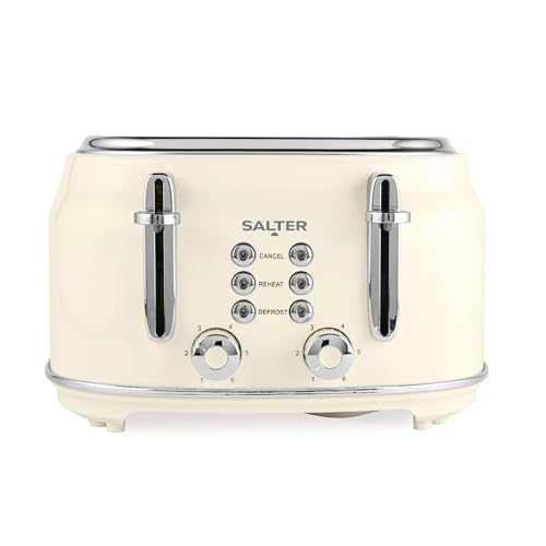 Salter EK5739CRM Retro 4-Slice Toaster – "Wide Slots, 6 Browning Levels, Defrost, Reheat, Cancel Functions, Removable Crumb Tray, Extra Thick Bread/Bagels, High-Lift Eject, Self-Centring, 1630W, Cream