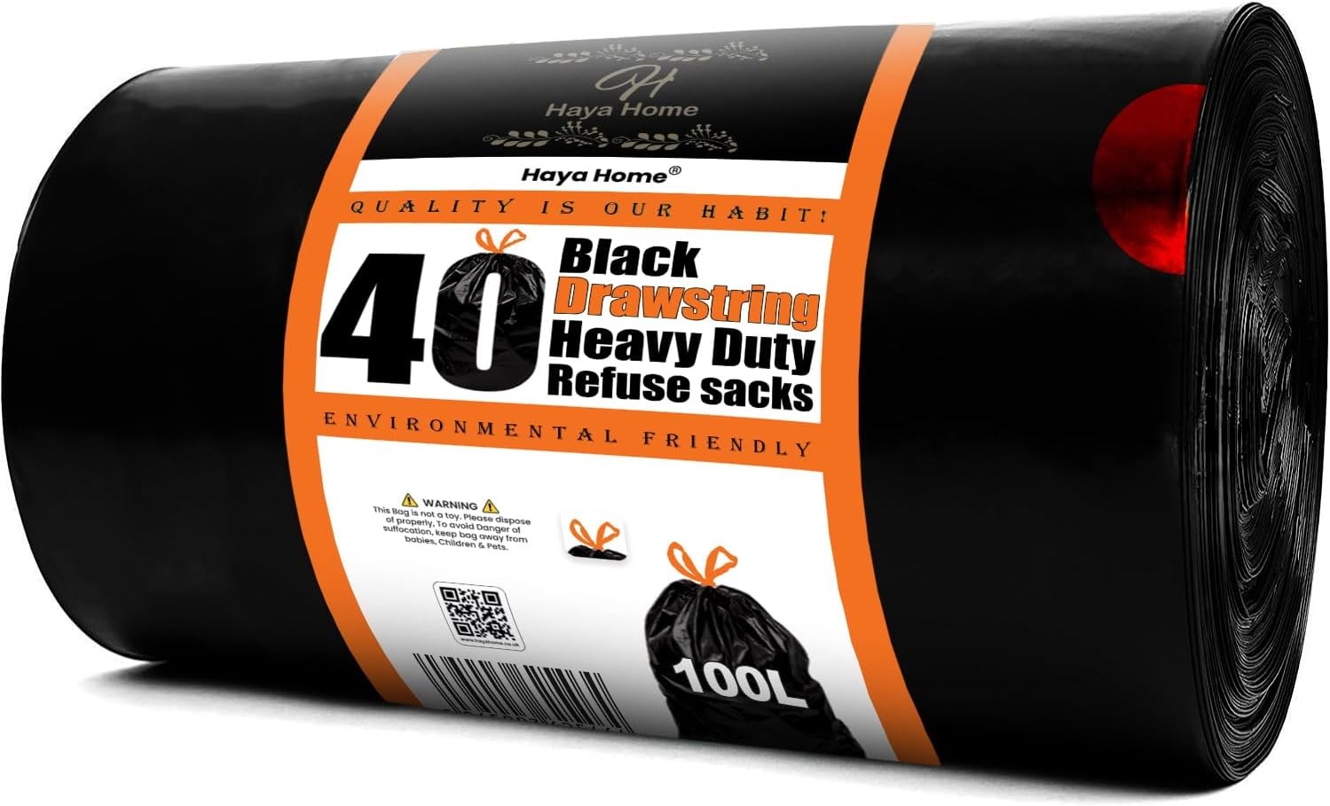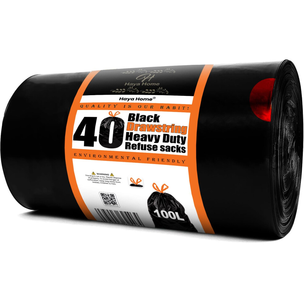 Haya Home 100L litre 40 Drawstring Bin Bags Heavy Duty Bin Liners Black Plastic Refuse Sacks tie top handle large Waste Dustbin Bags for Kitchen Home
