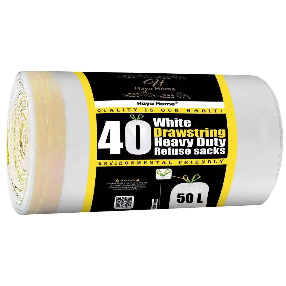 Haya Home 50L Litre 40 Drawstring Bin Bags Heavy Duty Swing Bin Liners Whit