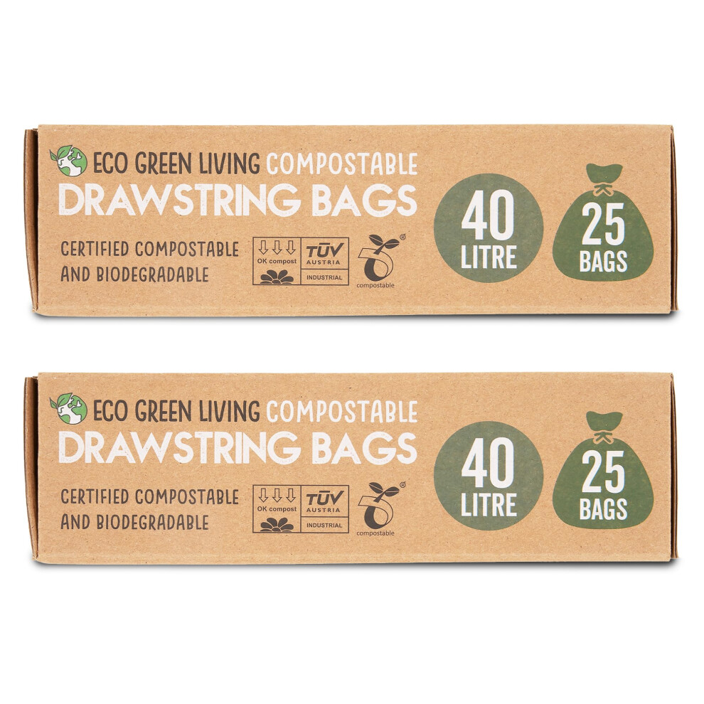 Eco Green Living 40 Litre Compostable Drawstring Bin Liners, Plastic Free & Leak Resistant Bin Bags for 30L and 40L Bins, 45.5 x 80 cm - Duo Pack (50