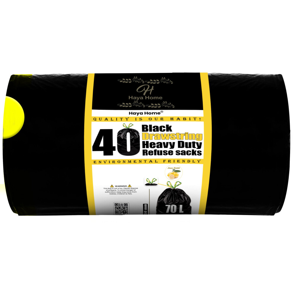Haya Home 70L litre 40 Drawstring Bin Bags Heavy Duty Bin Liners Black Plastic Refuse Sacks tie top handle large Waste Dustbin Bags for Kitchen Home