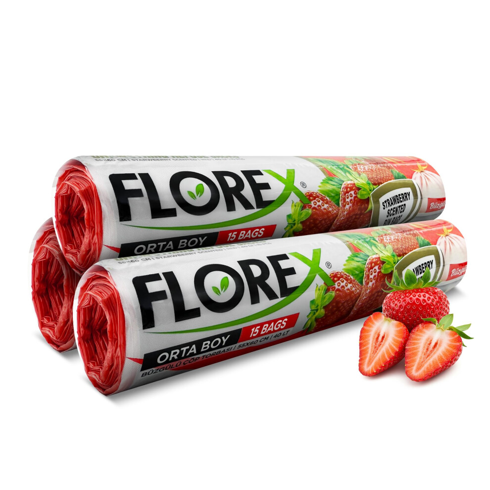 Florex 40 Litre bin bags with Drawstring, Strawberry Scented Bin Liners 3 Rolls (45 Bags) 55 x 60 cm for Home, Bathroom & Office - Kitchen Bin Bags
