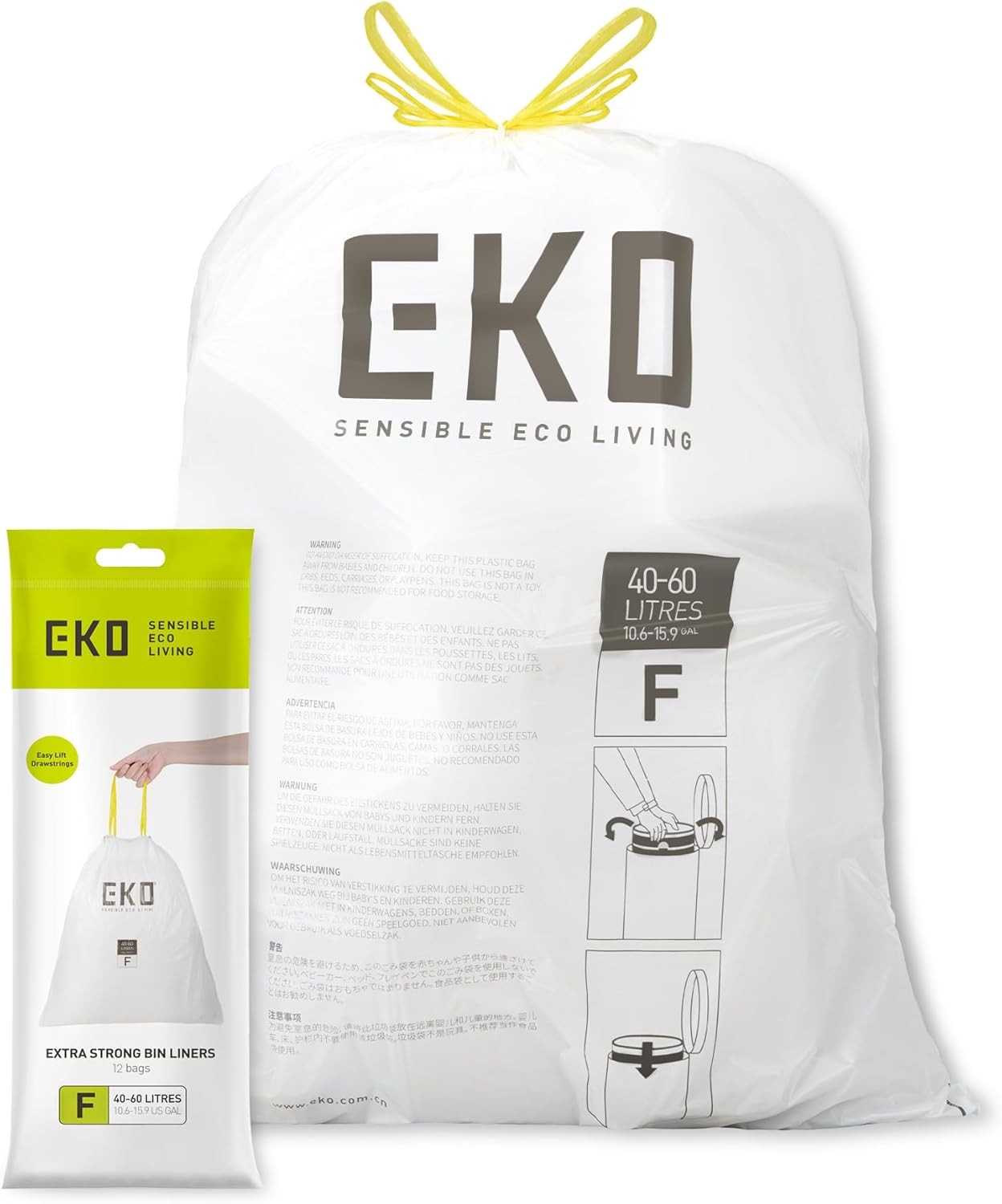 EKO 40-60 Litre Drawstring Bin Bags, Heavy Duty Kitchen Bin Liners for Pedal Bins, Leakproof and Tear-Resistant for Waste & Recycling, Unscented Food Waste Bags, 12 Count, Code F, White