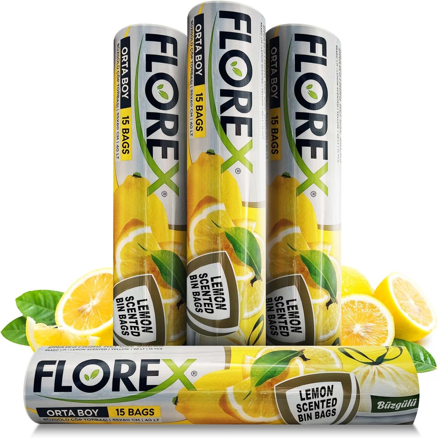 40L Swing Bin Liners with Drawstrings 60 Counts For a Refreshing Home or Office, Use as Kitchen Bin Bags or Bathroom Bin Liners Lemon Scented bin Bags 4 Rolls, Florex Trash bag