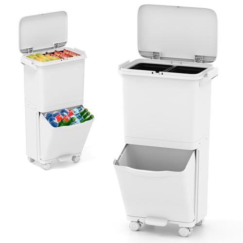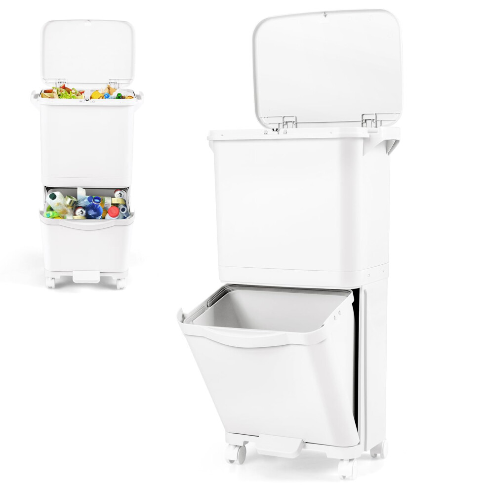 GiantexUK 40L Pedal Bin, 2-Tier Recycling Bins with 3 Compartments, Wheels, Handles & Classification Stickers, Garbage Can Waste Separation System for Home Office (42x28x74cm, with Removable Bins)