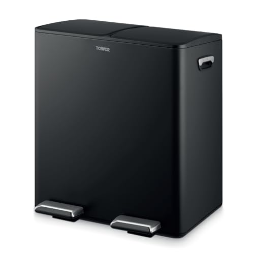 Tower T838022BLK Recycling Pedal Bin with Two 20L Compartments, Carbon Steel Body, Two Inner Buckets, 40L, Black