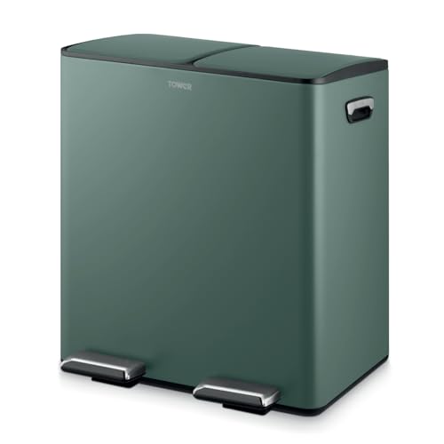Tower T838022FOR Recycling Pedal Bin, Two 20L Compartments with Removable Inner Buckets, Carbon Steel Body, 40L, Forest Green