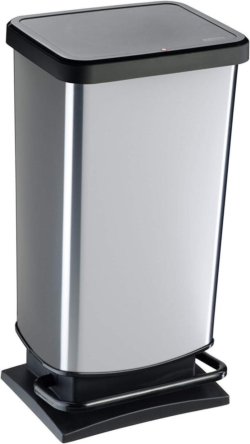 Paso Trash Can 40L with Lid and Pedal, Rotho Plastic Waste Bin, Silver Metallic