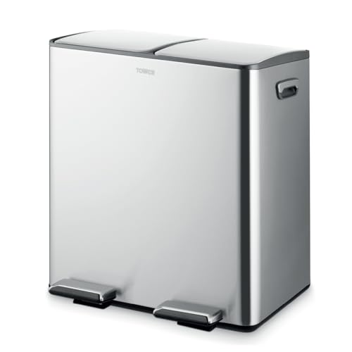 Tower T838022SS Recycling Pedal Bin, Two 20L Compartments with Removable Inner Buckets, Carbon Steel Body, 40L, Stainless Steel