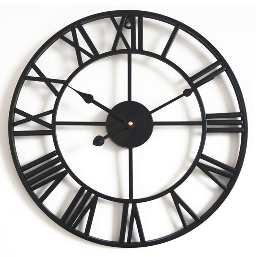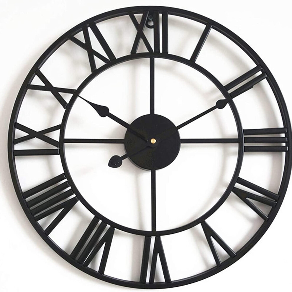 Outdoor Garden Wall Clock Large Black 45cm Wrought Iron Retro Roman Numerals Open Face Waterproof Mute Quartz Wall Clock
