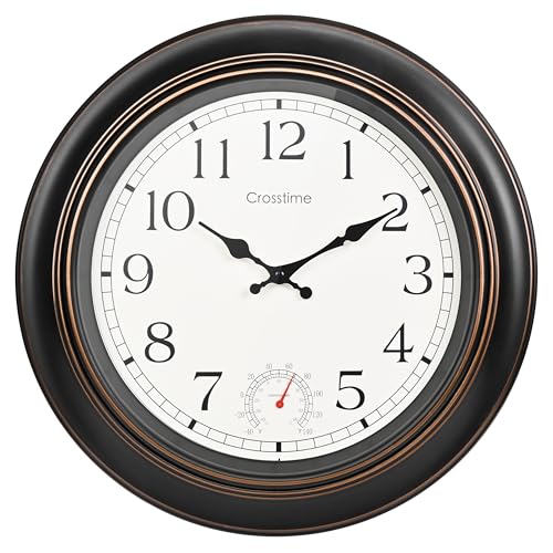 Crosstime Large Retro Vintage Waterproof Indoor Outdoor Wall Clock with Thermometer for Garden Patio Living Room Decor- Bronze, 45cm/18