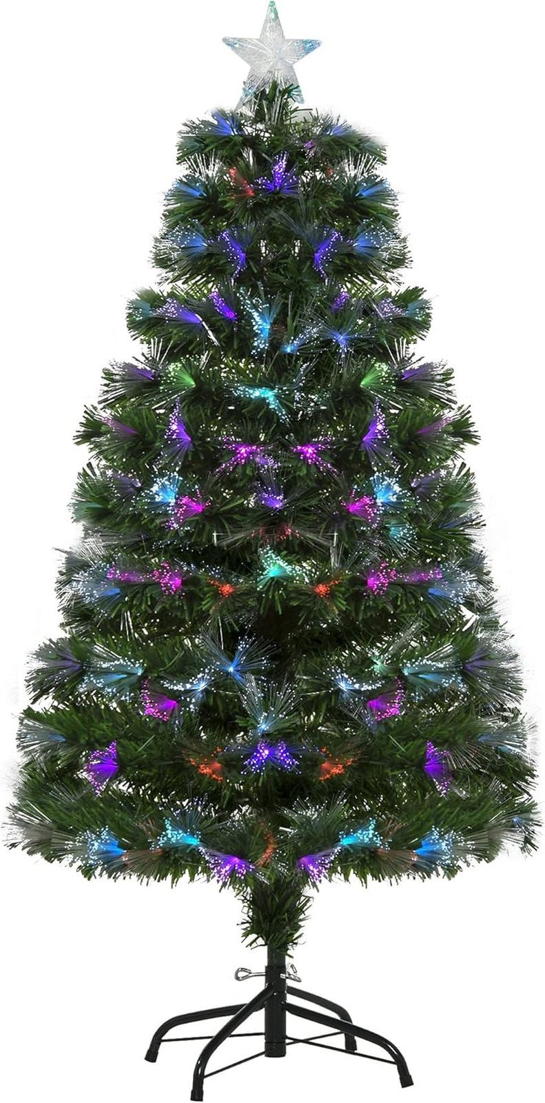 HOMCOM 4FT Multicoloured Artificial Christmas Tree w/Fibre Optic Lights Pre-Lit Modes Metal Stand Star Holder Home Seasonal Decoration