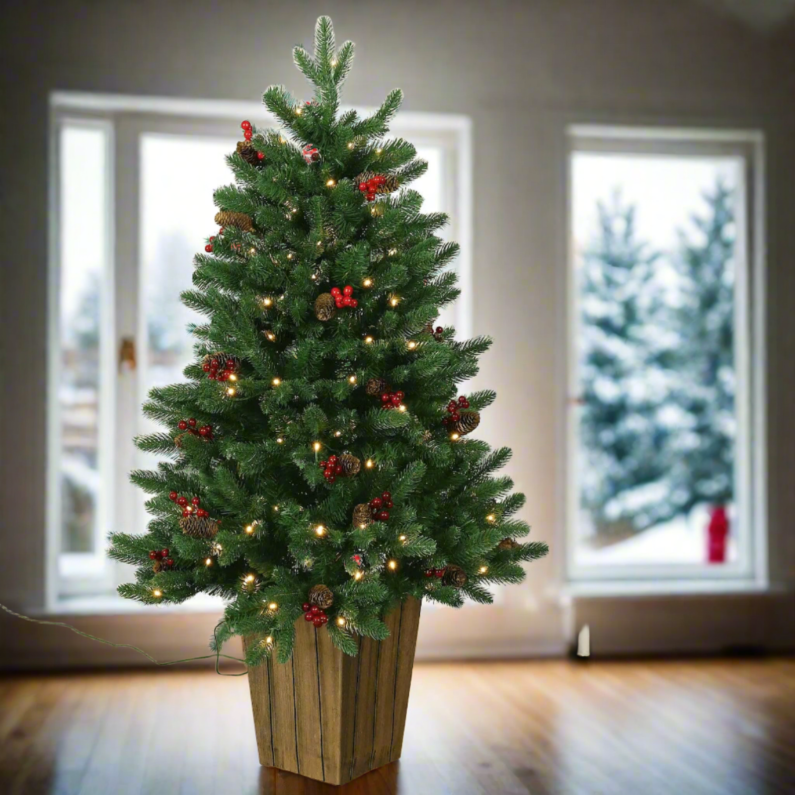 4ft LED Christmas Tree 140 Lights Red Berries Cones Green Pine Wood Effect Pot