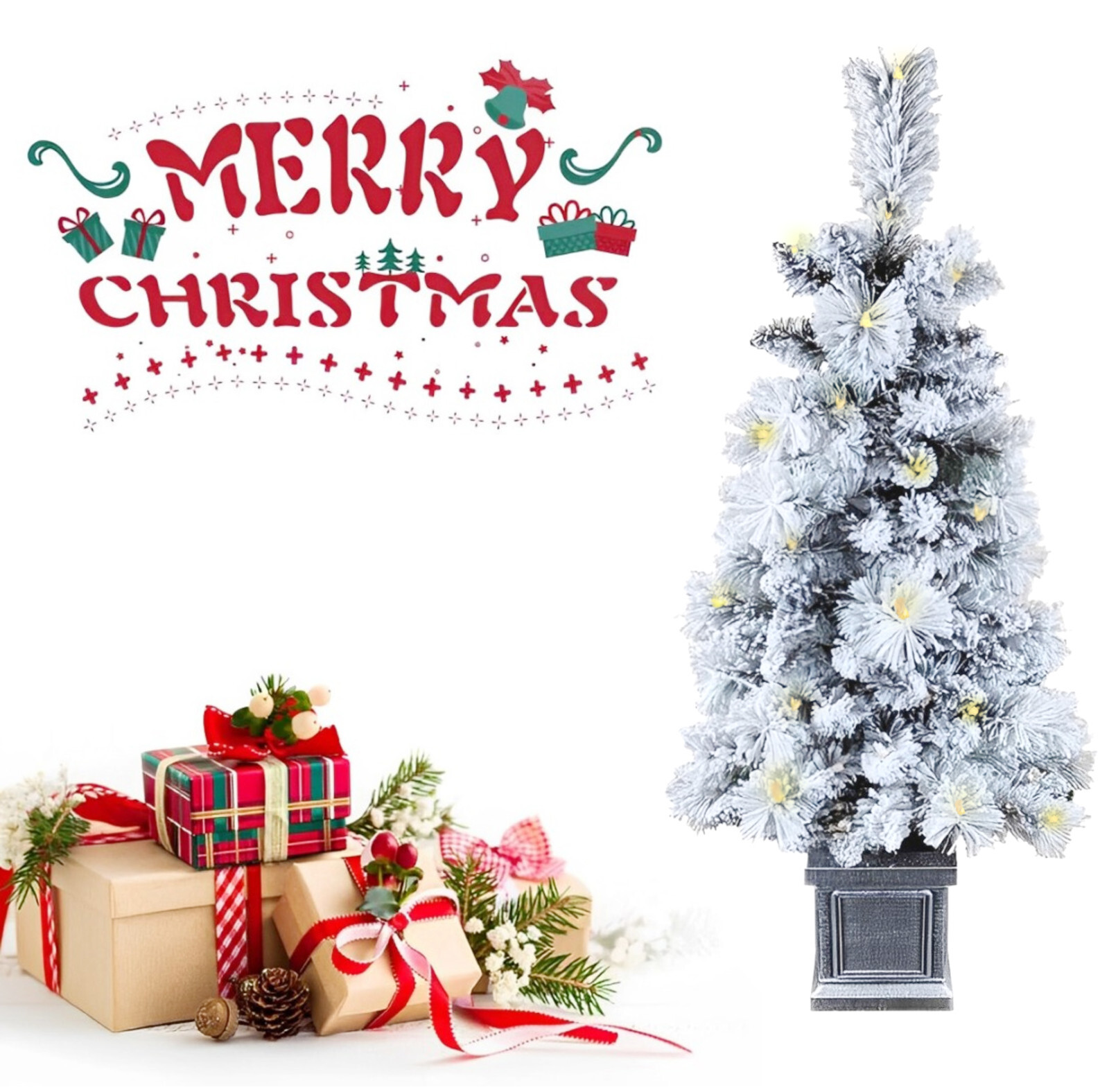 4Ft/1.2m Pre-Lit Yukon Snow Pine Artificial Green Christmas Tree Snow Flocked 230 Tips Branches Snowy Bushy Xmas Home Decorations, with 110 Warm White LEDs, Metal Stand