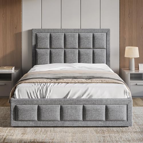 Ottoman Bed Frame, 4ft Small Double Upholstered Ottoman Bed, Grey Linen Fabric Ottoman Storage Bed with Gas Lift End Opening Wooden Slats with Storage Bed (4ft Small Double, No Mattress)