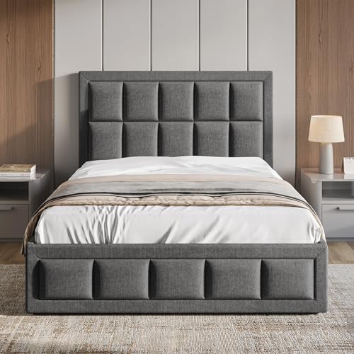 Ottoman Bed Frame, 4ft Small Double Upholstered Ottoman Bed, Dark Grey Linen Fabric Ottoman Storage Bed with Gas Lift End Opening Wooden Slats with Storage Bed (4ft Small Double, No Mattress)
