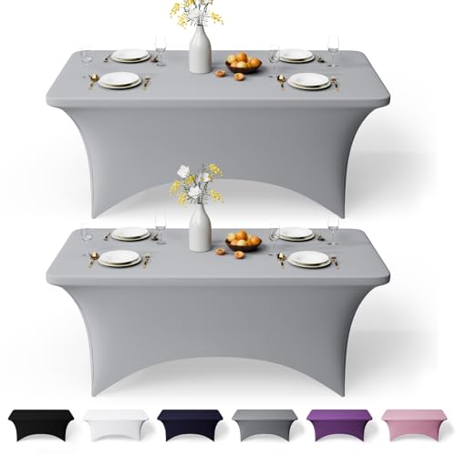 GFCC 4FT Spandex Table Covers 2 Pack - Grey Stretch Fitted Rectangular Tablecloth Washable & Wrinkle Resistant Spandex Tablecloths for Party, Wedding, Banquet, Events & Home