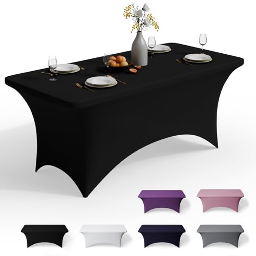 BDDC 4ft Table Cover Fitted, Black Spandex Table Covers, Washable and Wrinkle Resistant Stretch Tablecloths Rectangle for Events, Wedding, Banquets, Parties