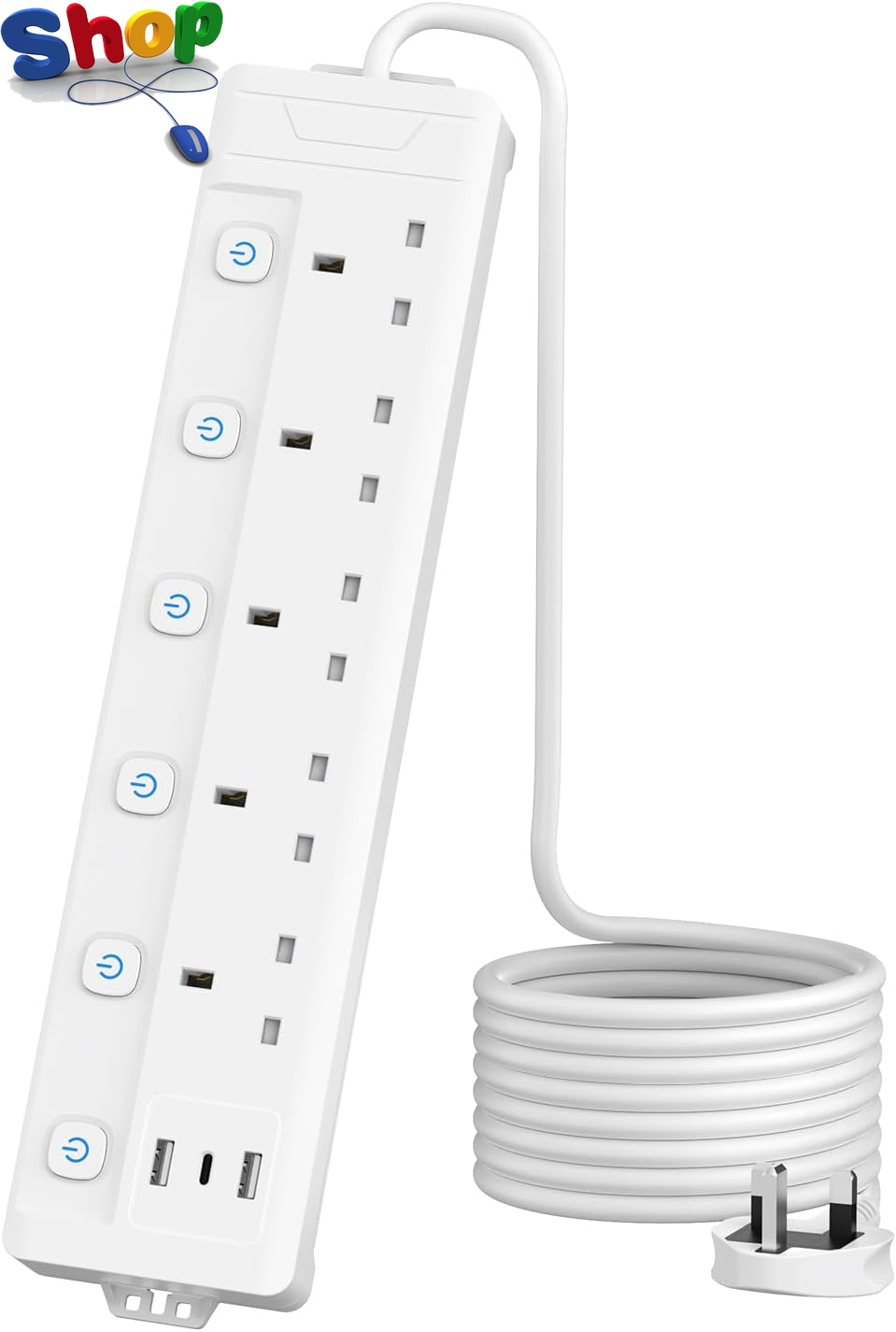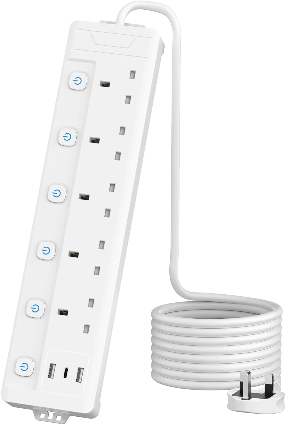 4M Extension Lead 5 Way with 3 USB Slots (2 USB-A,1 USB-C), Individually Switche