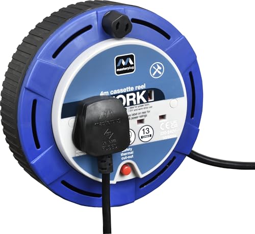 Masterplug Two Socket, 4 Metre Cassette Reel, Small Extension Lead Cable Reel, Wind-Up Retractable Power Cord Reel, Thermal Cut Out, Work Power, Blue/Black, 13A, 2G, 4m, SCT0413/2BL