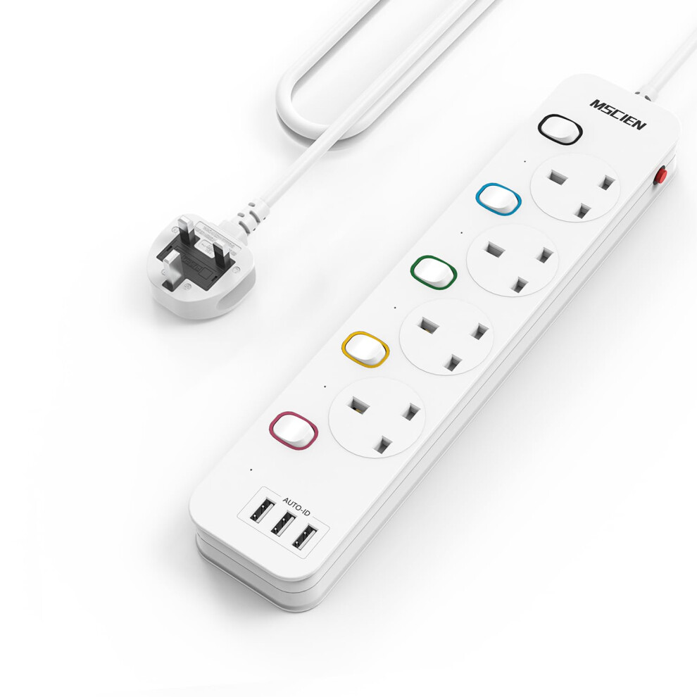 Mscien 4M Extension Lead with USB Slots, 4 Way 3 USB Extension Socket with Indiv