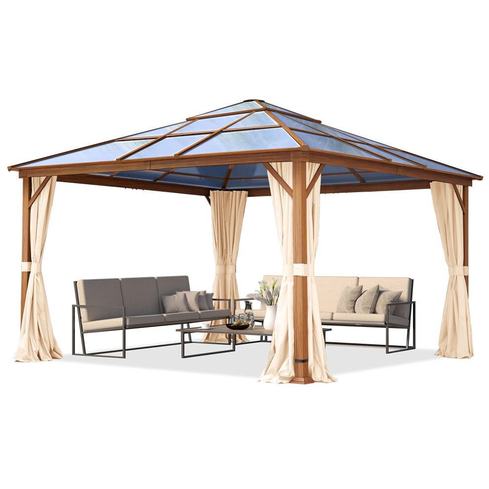 TOOLPORT Garden gazebo 4x4 m hardtop polycarbonate roof, wood finish, 4 side panels in champagne