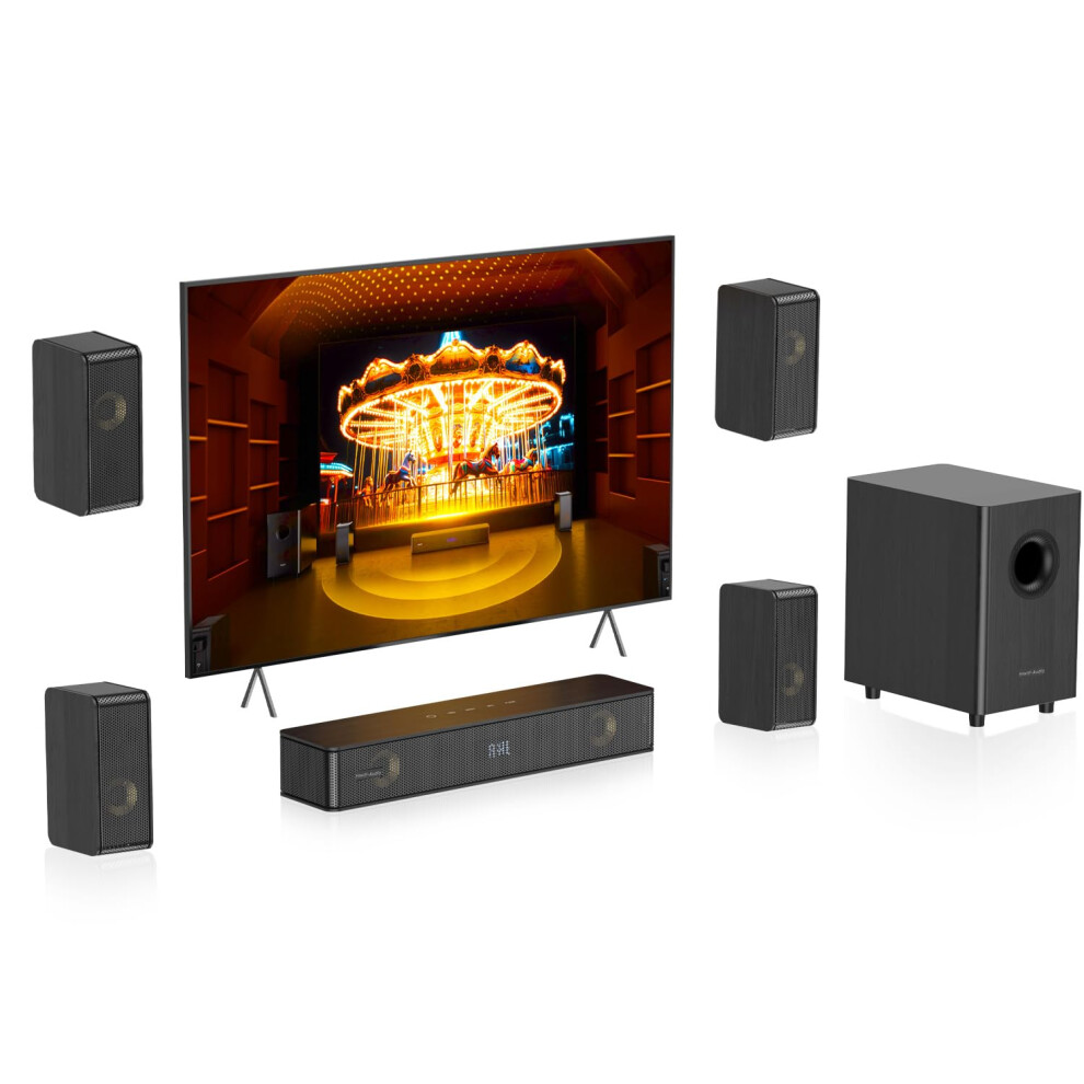 Hiwill-Audio Wooden 5.1.2CH Soundbars for TV, 4 Surround Speakers Wired, 400W Peak Power, Home Cinema Virtual Surround Sound System, 5.25'' Deep Bass Sound Bar with Subwoofer, ARC/OPT/BT 5.3/AUX/USB