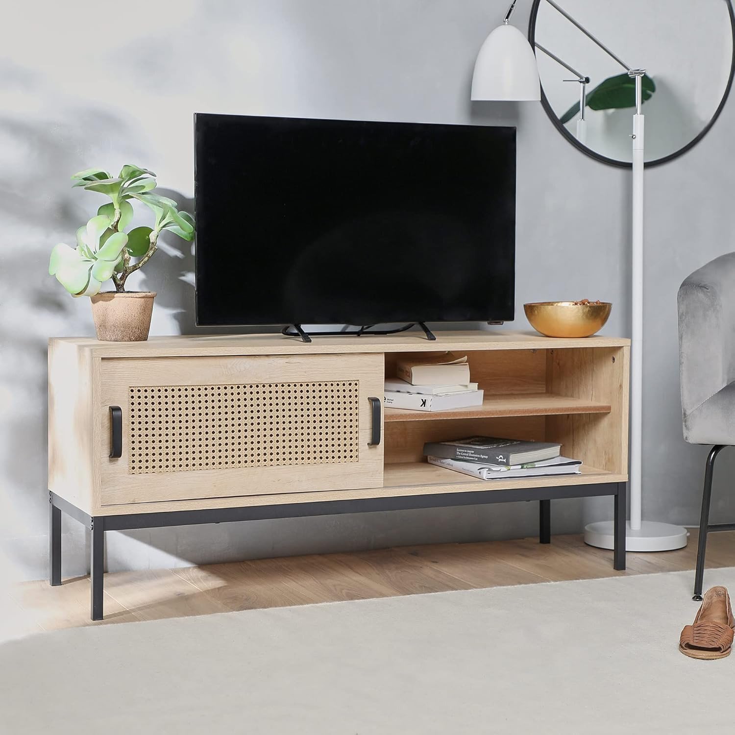 TV Stand Cabinet Rattan Effect Storage Unit for 55 Inch Television Scandi Wood