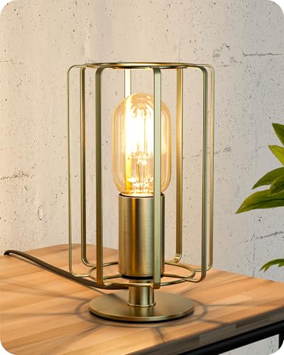 EDISHINE Table Lamp, E27 Socket & LED Bulb Included, 21.5CM, 2400K Bedside Lamp with Gold Cylindrical Flat Iron Cage Shade for Bedroom, Living Room