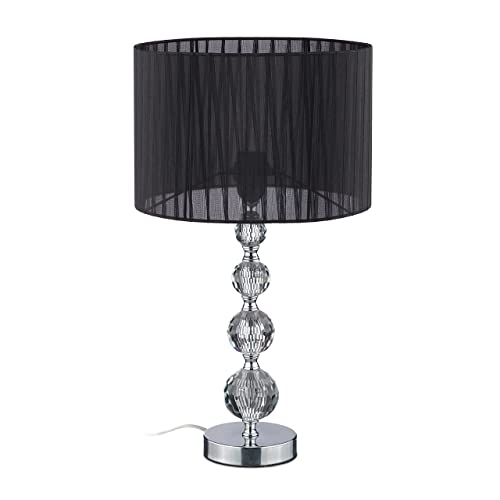 Relaxdays Crystal Table Lamp, Organza Lampshade, Round Base, Bedside Lamp, H x D 41 x 14.5 cm, Black/Silver
