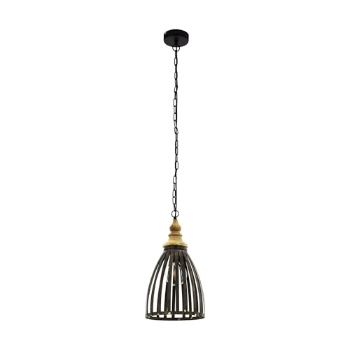 EGLO Oldcastle Pendant Light, 1-Bulb Industrial Vintage Retro Pendant Light Steel Wood in Black, Brown, Dining Table Lamp, Living Room Lamp with E27 Socket, Diameter 25.5 cm
