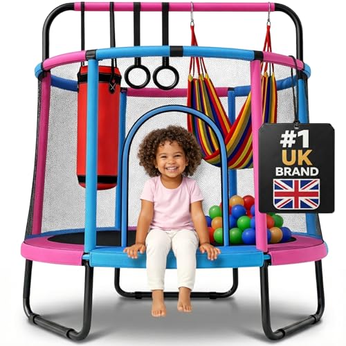 The Fellie Toddler Trampoline 5FT Trampoline for Kids 1.5M Indoor Outdoor Trampolines with Safety Enclosure Net, Basketball Hoop, Gymnastics Bar, Ball, Hanging Rings