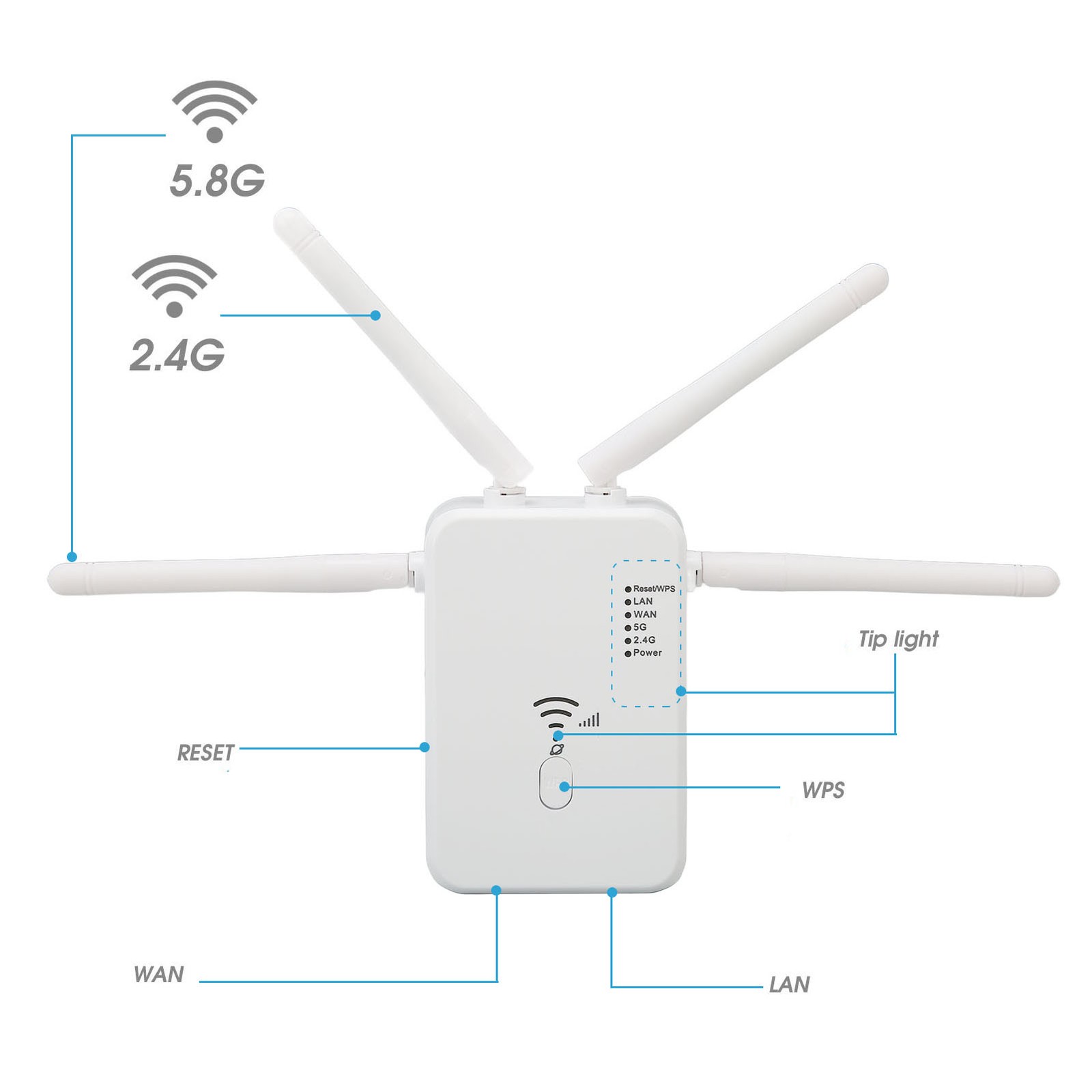 WiFi Range Extender, WiFi Booster, 2.4G 5G Dual Band, Four External Antennas, Wall Plug, For Home Use