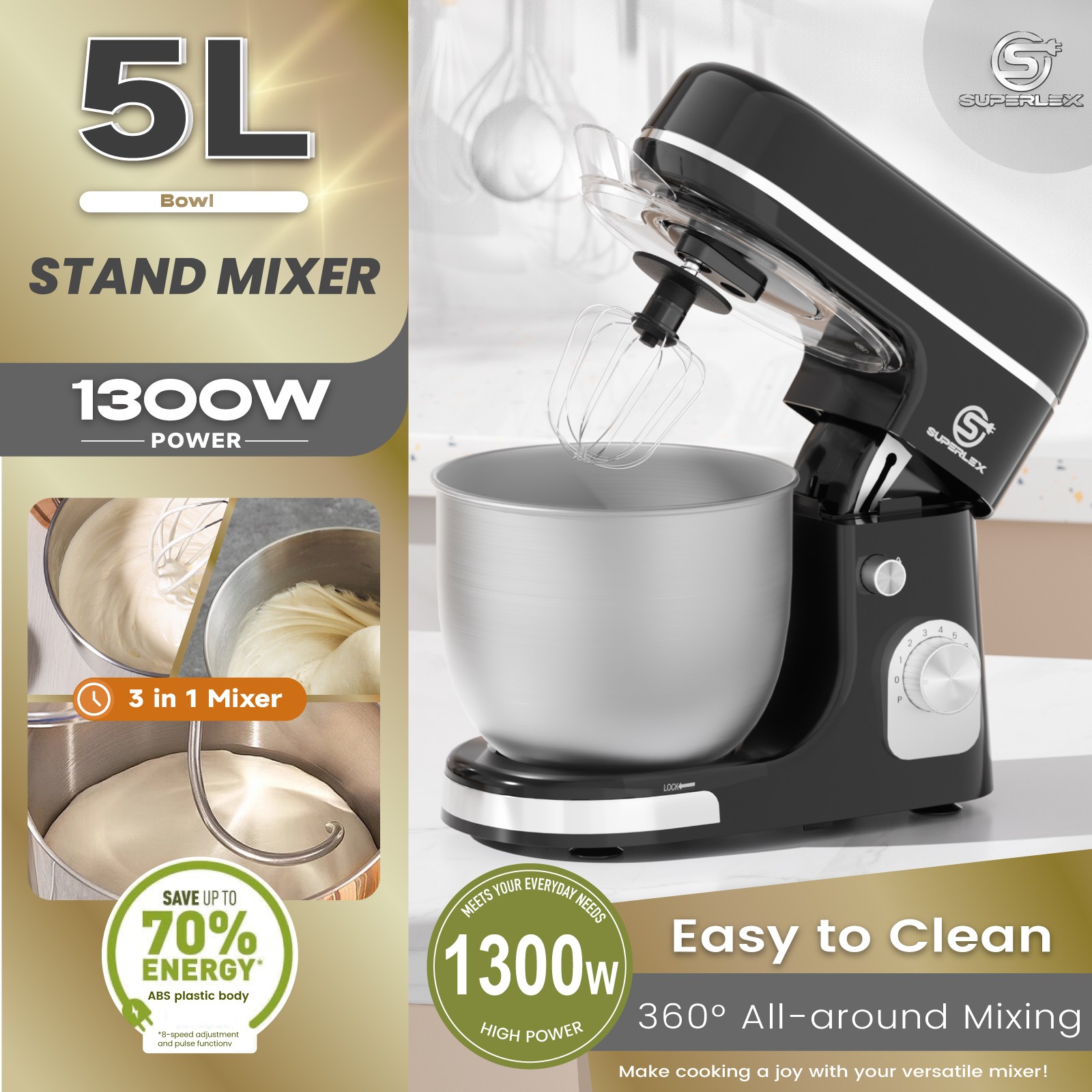 SUPERLEX 3-in-1 Stand Mixer 5L 1300W – 8-Speed Kitchen Mixer with 3 Attachments