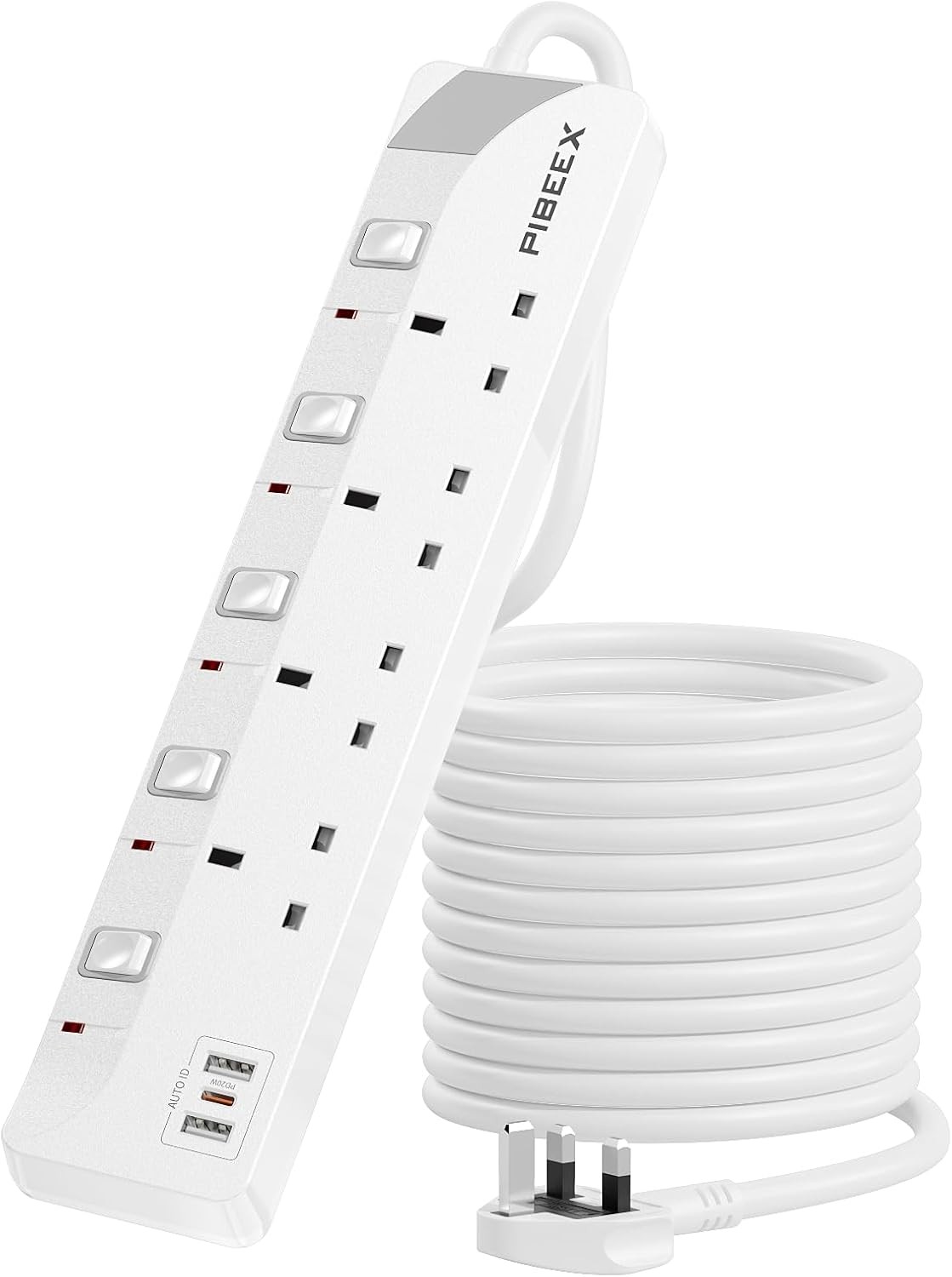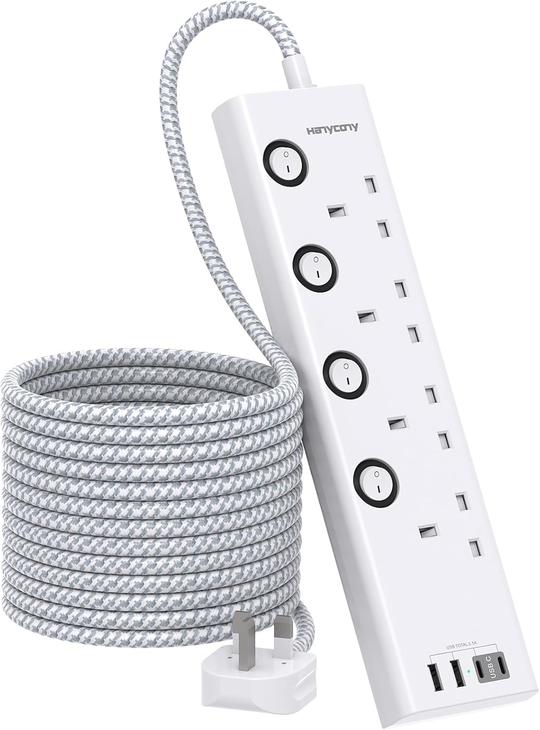 5M Extension Lead, 4 Way Socket with 4 USB Slots(2 USB C), Individually Switche