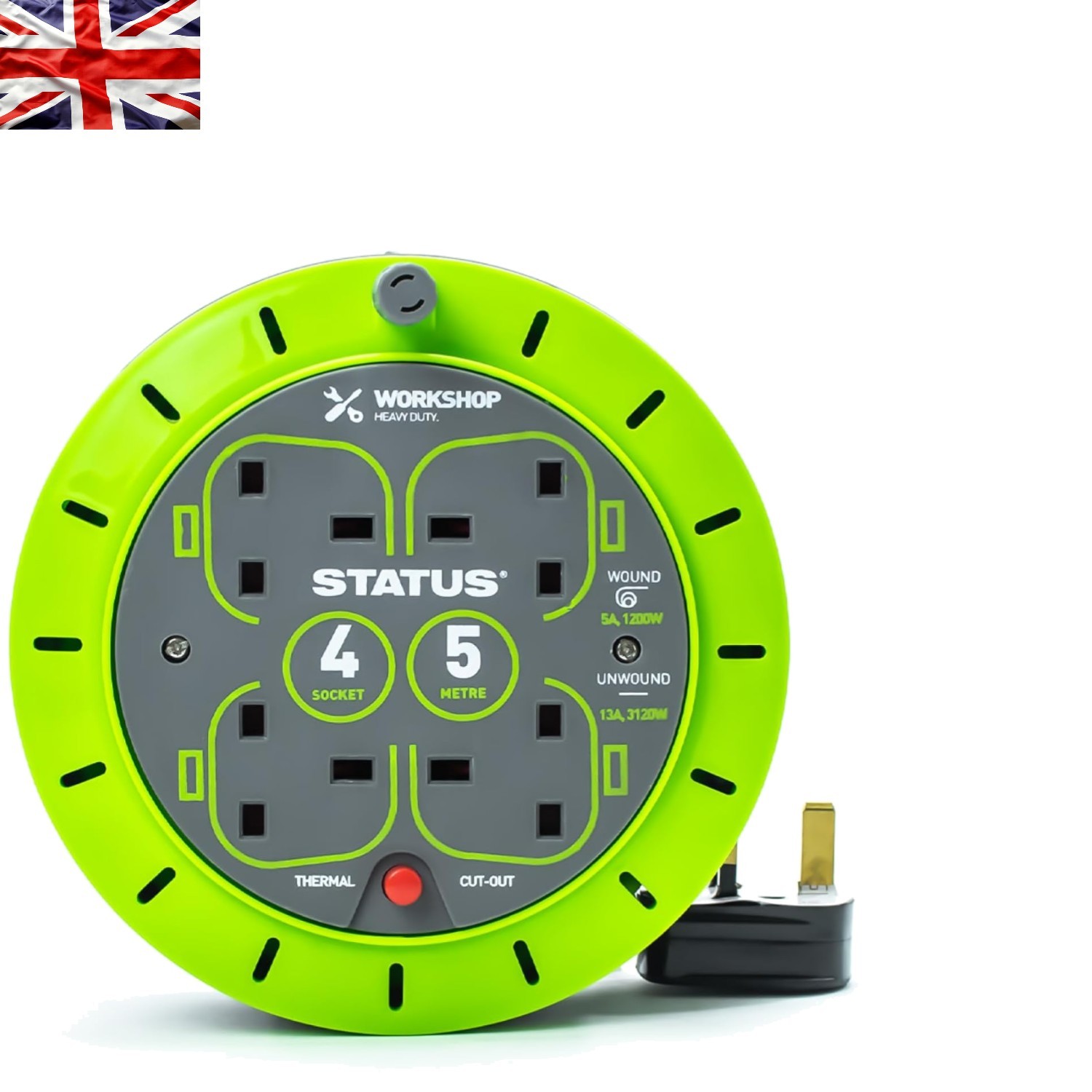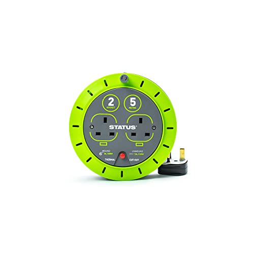STATUS 2 Socket Cable Reel 5m Green Extension Lead 13A with Thermal Cut Out H...