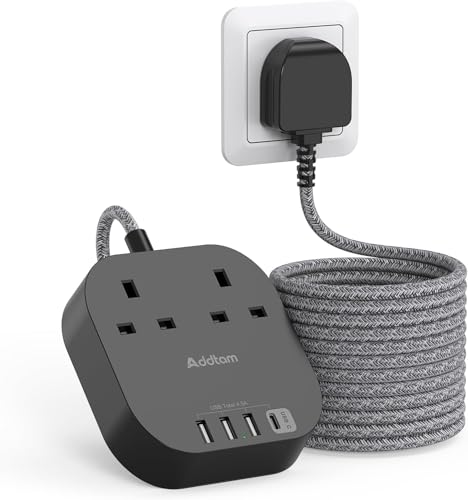 5M Extension Lead with USB Slots, Power Strips with 2 Way Outlets 4 USB (4.5A, 1 Type C and 3 USB A Ports) Surge Protection Plug Extension Socket with Braided Extension cord for Home/Office