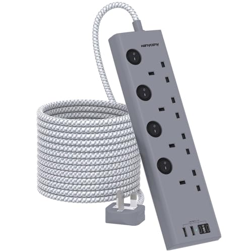5M Extension Lead, HANYCONY 4 Way Socket with 4 USB Slots(2 USB C), Individually Switched, Extension Cable 5M, Wall Mount Extension Cord, Gray Desk Power Strip for Home Office Accessories