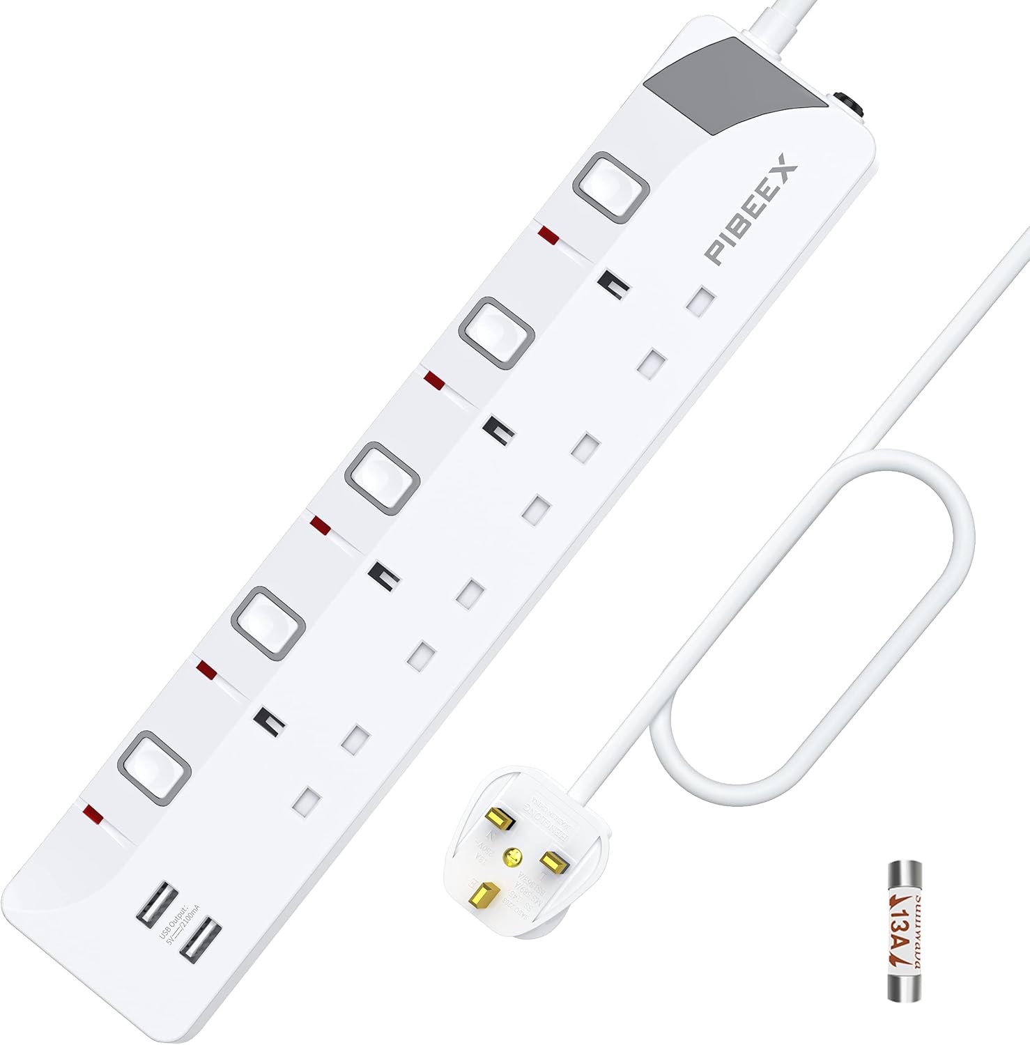 5M Extension Lead with Individual Switches, 13A 4 Way Power Strip 2 USB Lead with USB Slots Multi Plug Socket Extensions 5 Meters Long Extension Cord