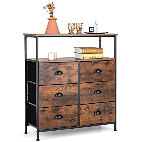 CAIYUN Chest of Drawers Bedroom with 6 Drawers, Tall Fabric Dresser with Shelf, Fabric Dresser for Entryway Hallway Living Room, Closet Storage Drawer, Rustic Brown