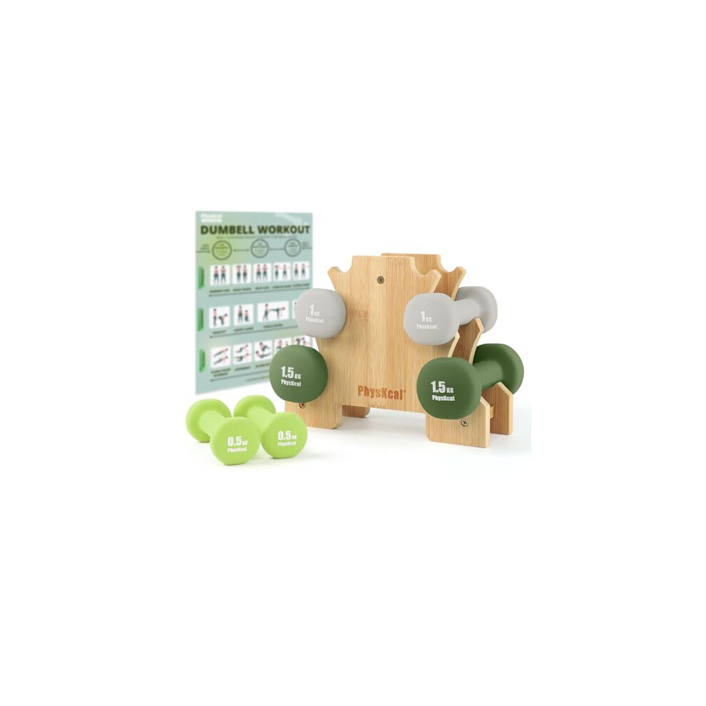 PhysKcal Dumbbells Set of 6 with Stand- 2 x 0.5 kg, 2 x 1 kg, 2 x 1.5 kg, Hand Weights Set for Ladies, Kids, Beginners, Light Small Dumbbells Set for Home Gym Studio Workout