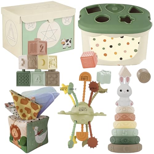 Auezona 5 in 1 Montessori Baby Toys for 6-12 Months – Stacking Toys, Shape Sorter, Baby Tissue Box, Sensory & Early Development Toy | Gift for 6+ Month Old Babies
