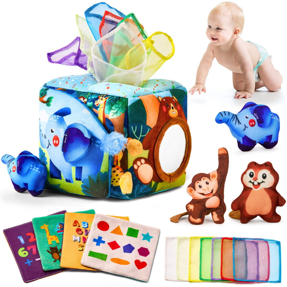 hahaland Baby Tissue Box Toy, Baby Toys 0-6 Months+ Montessori Toys for 6 Month Old with Textured Tails, Cloth Tissues, Crinkle, Squeaky Sounds,